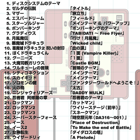 CDカタログトップへ戻る ファミコン・ベストコレクション Vol.1 収録曲:全28+4曲 収録時間:79分56秒 制作:2002/06/16 頒布価格:1,500円 作品番号:002 作品解説 ファミコン・ベストコレクションシリーズの、記念すべき第1弾作品です!この作品の歴史が、EtlanZの歴史といっても過言ではありません。 きっと、沢山の想い出が、ここにあります。かつてファミコンをプレイした全ての人達に捧げる一枚です! 試聴曲MP3 スターソルジャー「メインテーマ&パワーアップ」試聴する ワルキューレの冒険「冒険のテーマ」試聴する CDカタログトップへ戻る